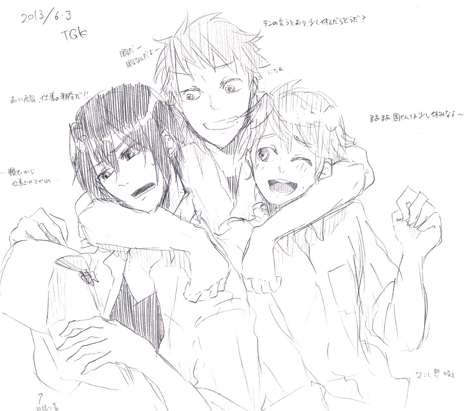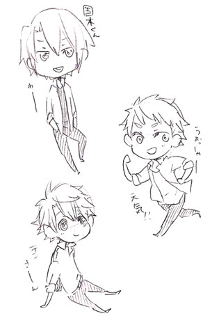 スキャナりました。前回描いたテンくん、元気、国くんの三人をまあざっとですが頭身ちゃんとさせたやつです。